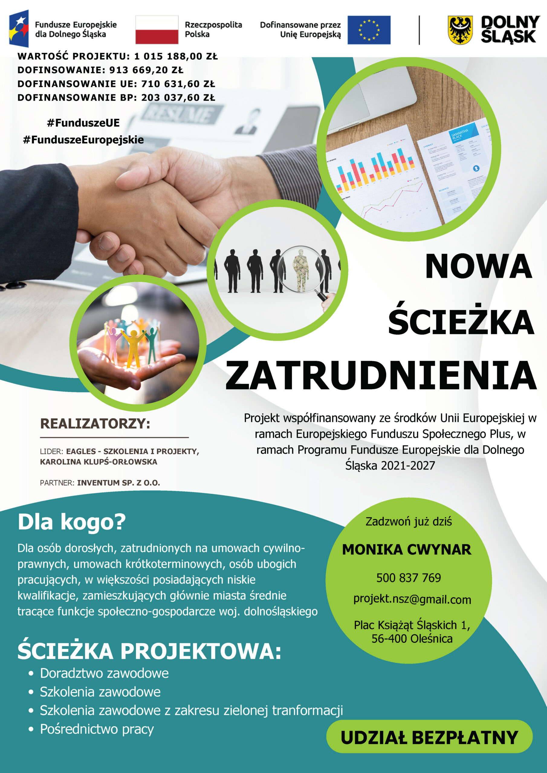 pracy u osób dorosłych, zatrudnionych na umowach cywilno-prawnych, umowach krótkoterminowych, osób ubogich pracujących, w większości posiadających niskie kwalifikacje, zamieszkujących głównie miasta średnie tracące funkcje społeczno-gospodarcze województwa dolnośląskiego, dzięki realizacji programu aktywizacyjnego zawierającego usługi rynku pracy obejmujące doradztwo zawodowe z IPD, szkolenia zawodowe, szkolenia z zakresu zielonej transformacji, pośrednictwo pracy,